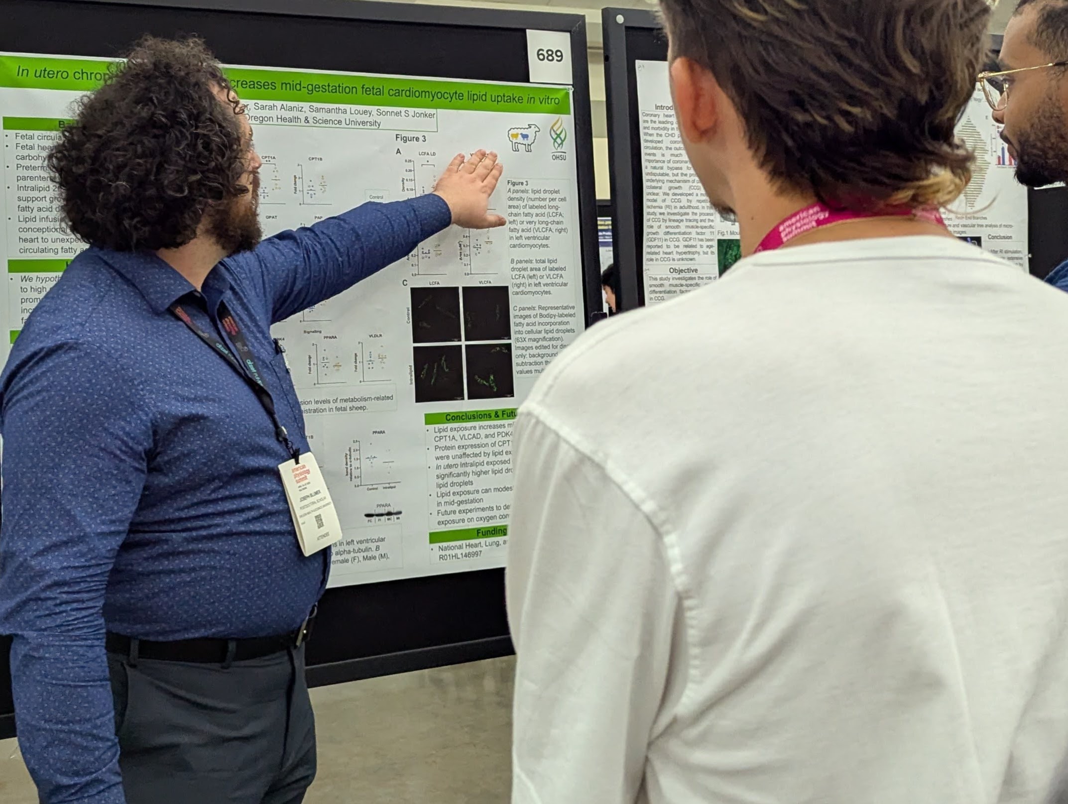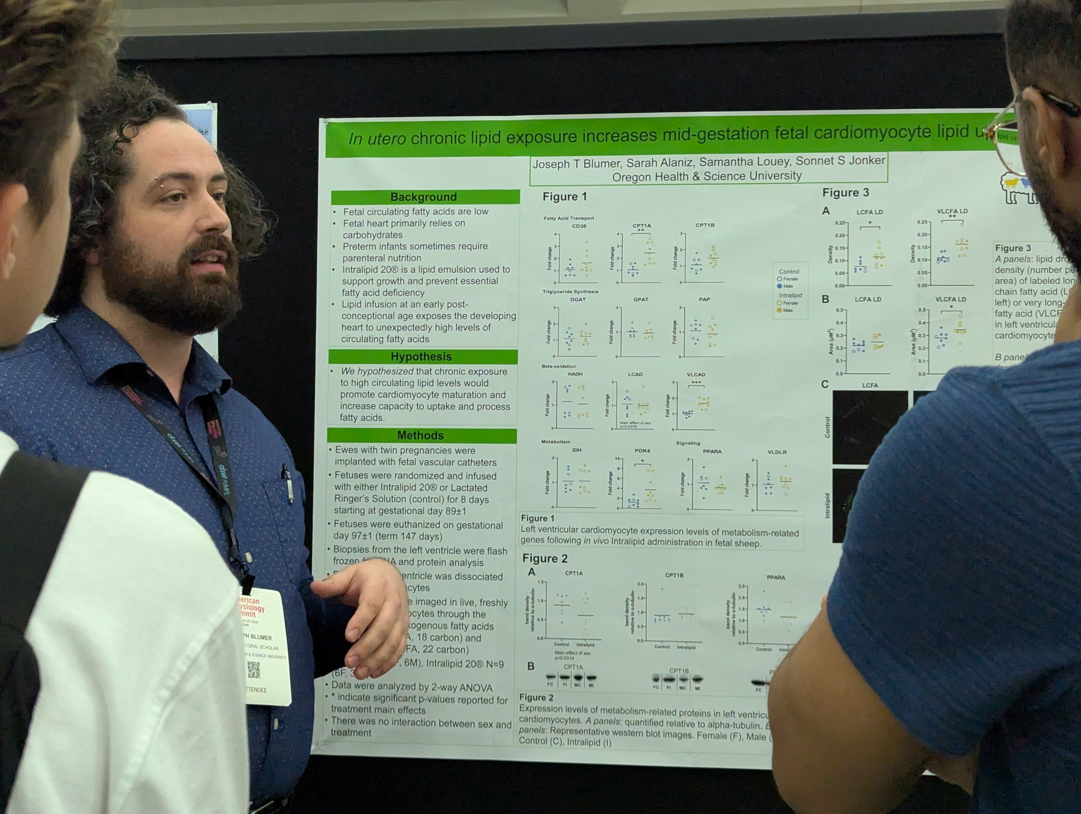 Joseph Blumer attended the American Physiology Summit in Baltimore, Maryland, where he presented his abstract “In utero chronic lipid exposure increases mid-gestation fetal cardiomyocyte lipid uptake in vitro.” One surprising finding from his research was that, even though fetal cardiomyocytes at this stage typically don’t interact with lipids, they still responded to high lipid exposure by taking up more labeled lipids. This suggests that early lipid exposure, which is not typical for these cells, could be detrimental by altering their physiology and metabolism. It challenges our previous understanding of fetal heart development and raises concerns about how environmental factors, like maternal diet, could affect the developing heart.